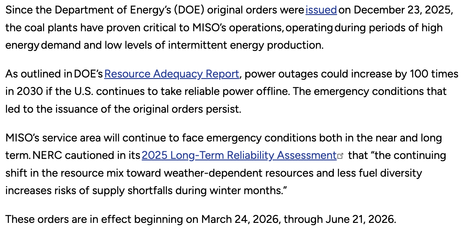 You may have read about the DOE’s recent extension of the order to keep the two coal plants online. According to the press release announcing the extension: