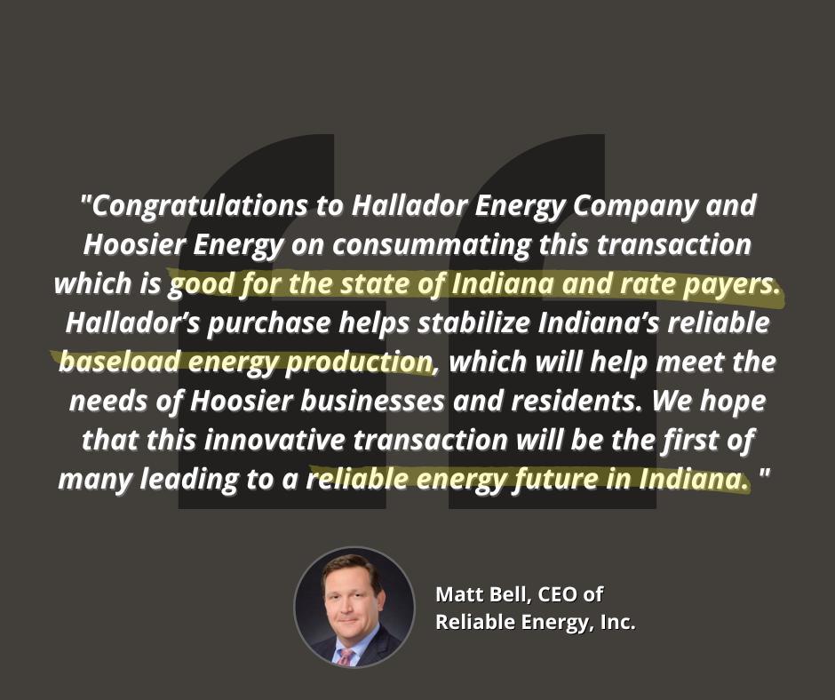 Reliable Energy Inc.’s CEO Matt Bell released the following comments over the weekend congratulating both Hallador Energy Company and Hoosier Energy: