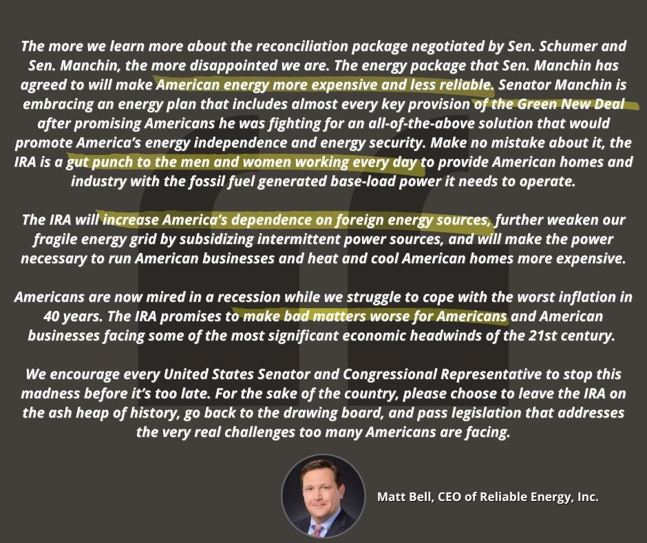 “The more we learn more about the reconciliation package negotiated by Sen. Schumer and Sen. Manchin, the more disappointed we are. The energy package that Sen. Manchin has agreed to will make American energy more expensive and less reliable. Senator Manchin is embracing an energy plan that includes almost every key provision of the Green New Deal after promising Americans he was fighting for an all-of-the-above solution that would promote America’s energy independence and energy security. Make no mistake about it, the IRA is a gut punch to the men and women working every day to provide American homes and industry with the fossil fuel generated base-load power it needs to operate.